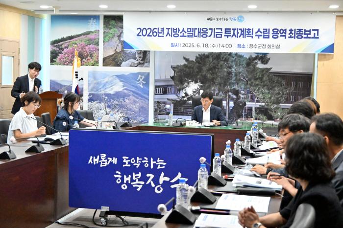 장수군은 18일 군청 회의실에서 ‘2026년 지방소멸대응기금 투자계획 수립’ 용역 최종 보고회를 열고 기금 최대 확보를 위한 전략을 점검했다.이번 보고회는 최훈식 군수를 비롯한 부군수, 관련 부서장 등 …