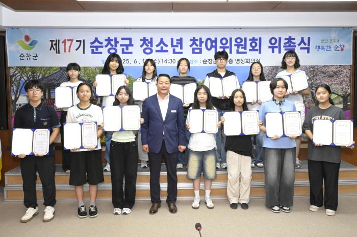 순창군이 18일 군청 영상회의실에서 제17기 순창군 청소년참여위원회 위촉식을 개최했다.이날 위촉식은 청소년참여위원회 위원으로 선발된 18명의 청소년에게 최영일 군수가 직접 위촉장을 전수하고, 위원들…