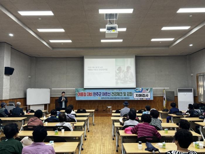 완주군 지역사회보장협의체 건강사랑 분과가 경천면 경천애인 강당에서 어르신 50여 명을 모시고 여름철 대비 어르신 건강강좌를 진행했다.건강강좌는 박기홍 우석대학교 호텔외식조리학과 교수를 초빙해 여…