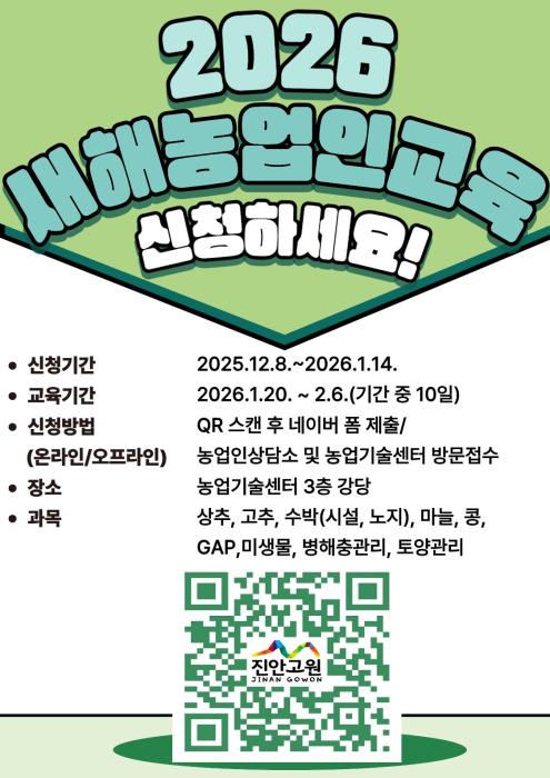 진안군이 ‘2026년 새해농업인 실용교육’ 참여 교육생을 다음달 14일까지 모집한다.군은 농업 경쟁력 향상과 기후 변화 대응 역량 강화를 위해 총 1,000명 규모, 10개 과정의 집합교육을 편성해 내년 1월 2…