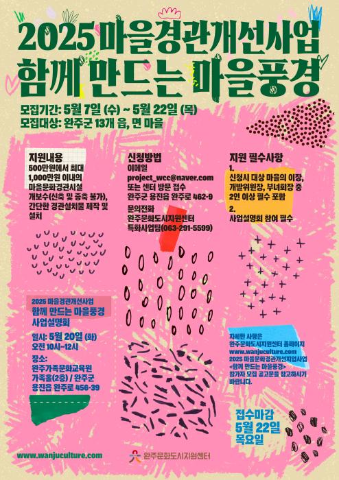 완주문화도시지원센터가 주관하는 ‘2025 마을경관개선사업–함께 만드는 마을풍경’ 사업설명회가 20일 오전 10시에 완주가족문화교육원 가족홀에서 열린다.이번 설명회는 2025년 마을경관개선 공모사업에 …
