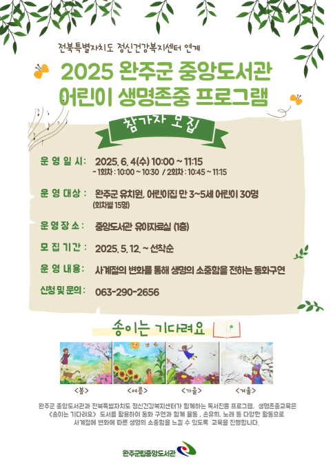 완주군 중앙도서관에서 오는 6월 4일 관내 만 3세~5세 유아를 대상으로 생명존중교육 프로그램을 운영한다.이번 프로그램은 생명의 소중함과 어린이들의 건강한 마음 성장을 위해 도서관과 전북특별자치도 …
