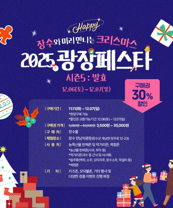 장수군은 6일부터 7일까지 이틀간 장수 만남의광장(더레드하우스 앞)에서 올해 마지막 광장페스타인 ‘시즌5: 미리크리스마스’를 개최한다고 밝혔다.이번 광장페스타는 어린아이부터 어른까지 모두가 즐길 …