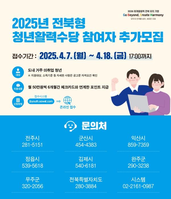 군산시가 미취업 청년들의 활발한 구직활동을 지원하는 ‘2025년 전북형청년활력수당’ 참여자를 4월 18일까지 추가로 모집한다.본 사업은 청년취업 소요 기간의 장기화로 구직활동에 부담을 느끼는 청년이 …