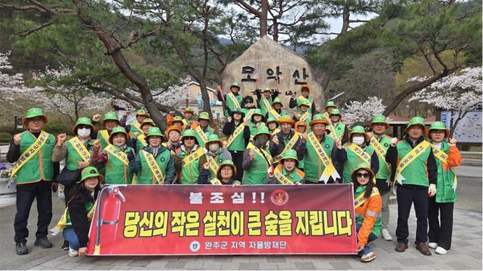 완주군 지역자율방재단(단장 소병오)이 제80회 식목일을 맞아 모악산 일대에서 산불예방 캠페인을 실시했다.최근 열린 행사에는 지역자율방재단원 40여 명이 참여해 ‘불조심! 당신의 작은 실천이 큰 숲을 …