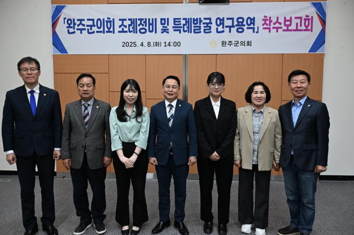 완주군의회 조례정비 및 특례발굴 연구회(대표 성중기 의원)는 8일 군의회 문화강좌실에서 ‘조례정비 및 특례 발굴 연구용역’ 착수보고회를 갖고, 본격적인 과업 추진에 들어갔다.이번 착수보고회는 「지…