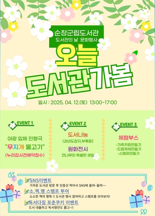 순창군립도서관이 오는 4월 12일 ‘오늘도서관가봄’ 문화 행사를 개최한다.행사는 12일 오후 1시부터 5시까지 군립도서관에서 진행되며, 인형극 공연과 다양한 전시, 체험 활동 등 풍성한 프로그램으로 도…