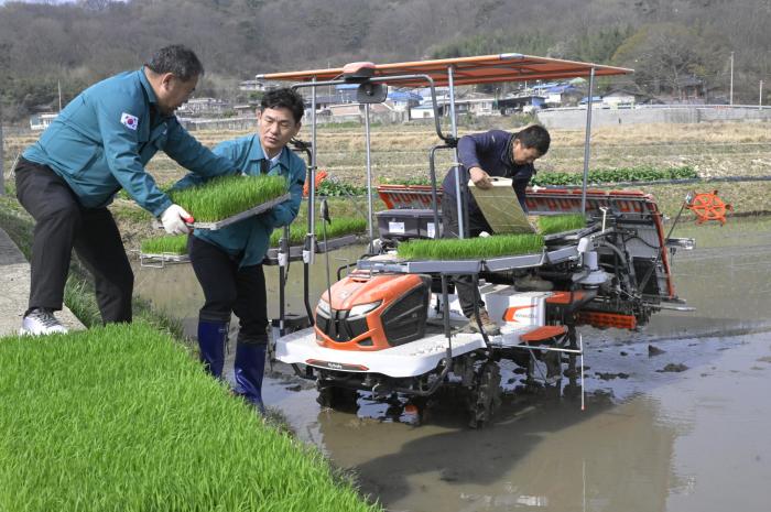 8일 순창군 풍산면 도치마을의 박동민(44) 씨가 논 2.7ha에 올해 첫 모내기를 시작하며 지역 농업에 활기를 불어넣는 뜻깊은 첫발을 내디뎠다.이날 염기남 순창부군수는 직접 현장을 찾아 모판을 나르고 이…