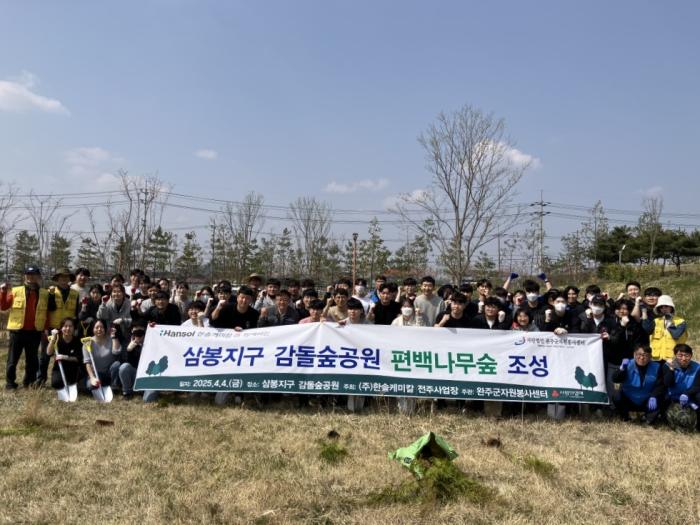 완주군, (사)완주군 자원봉사센터, ㈜한솔케미칼 전주공장 임직원, 케이워터기술(주)전주사업소 임직원들이 지난 4일 식목일을 앞두고 삼봉지구 감돌숲공원에 편백나무 400그루를 심었다.이날 심은 편백나무…