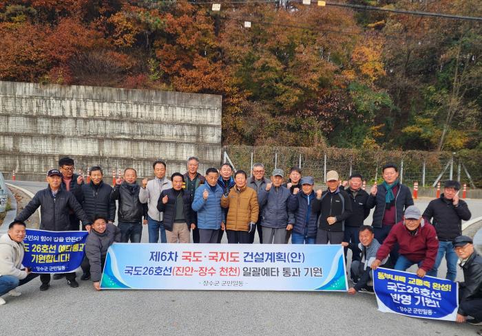 장수군 군민들은 20일 국도 26호선 선형개선 대상 구간 일대에서 제6차 국도·국지도 건설계획 반영을 촉구하며 국도 26호선(진안~장수 천천) 구간의 일괄예비타당성조사 통과를 기원하는 군민 참여 캠페인…