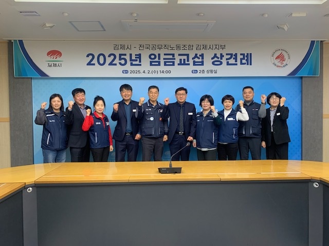 김제시(시장 정성주) 지난 2일 김제시공무직노동조합과 2025년 임금협약을 위한 상견례를 개최했다고 밝혔다.이날 상견례는 김진수 자치행정국장을 비롯한 시측 교섭위원 5명과 노조측 교섭위원 6명이 참석…