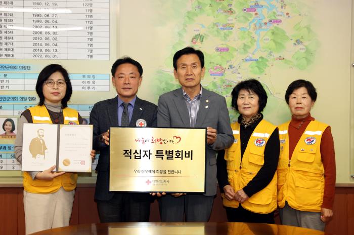 진안군의회(의장 동창옥)가 22일 진안군의회 의장실에서 대한적십자사 전북특별자치도지사에 2026년 적십자 특별회비를 전달하고 나눔을 실천했다.이날 특별회비 전달식에는 동창옥 의장을 비롯해 김한규 대…
