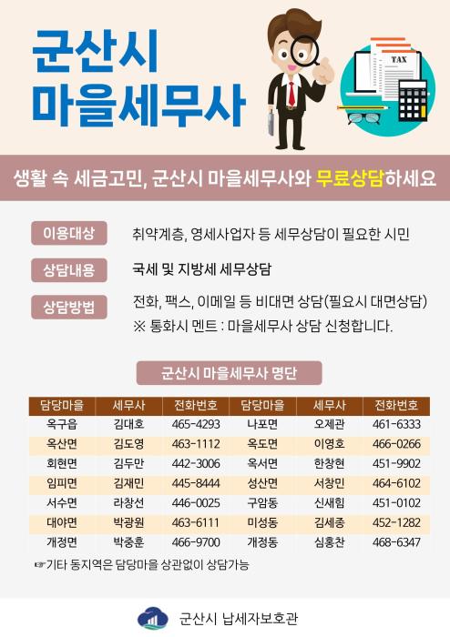 군산시(시장 강임준)가 무료 세무 상담 서비스인 ‘마을세무사’를 운영하며 시민들의 세금 고민 해소에 나서고 있다.‘마을세무사’는 영세사업자, 농어촌 주민 등 세무사 이용이 어렵거나 납세 불편을 겪…