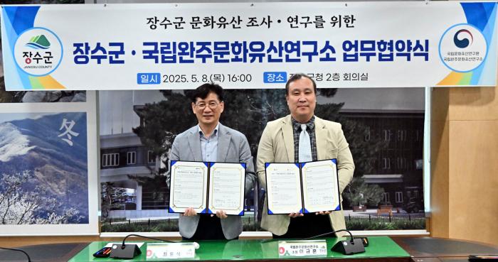 장수군은 지난 8일 군청 회의실에서 국립완주문화유산연구소(소장 이규훈)와 업무협약식을 체결했다.이번 협약은 지역의 고대 문화자원인 합미산성을 비롯해 대성고원 일대에 잠들어 있는 역사문화를 발굴하…