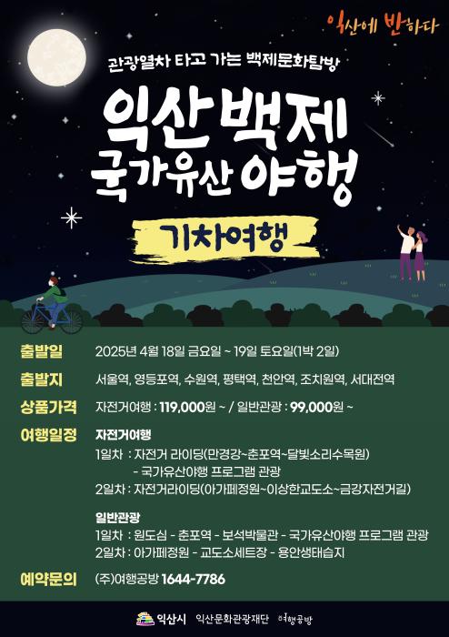 익산시는 익산문화관광재단(대표이사 김세만)과 함께 '2025 익산백제 국가유산 야행'과 연계한 1박 2일 임시열차 관광 상품을 운영한다고 10일 밝혔다.이번 관광상품은 오는 4월 18~19일 운영되며, 일반 관…