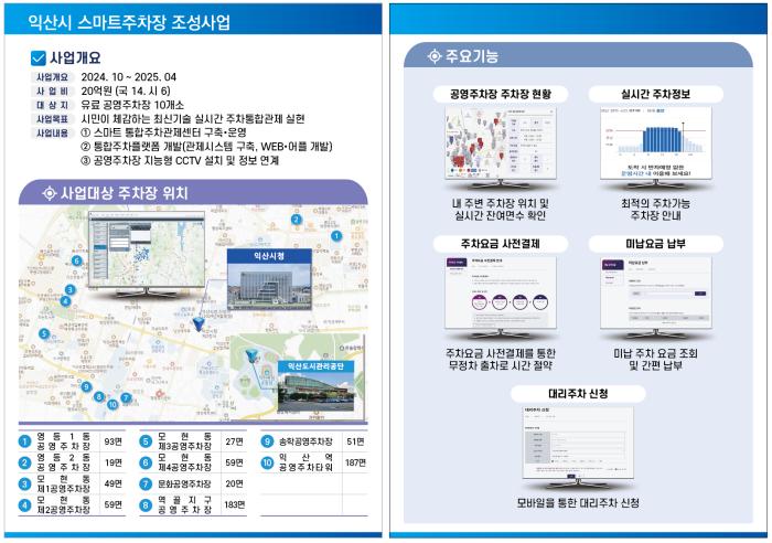 익산시가 '스마트 주차장 조성 사업'을 통해 유료 공영주차장 10개소(750여 면)에 인공지능형 통합 운영 시스템을 도입한다.양경진 익산시 건설국장은 19일 정례 브리핑을 통해 "시민들의 주차 불편을 획기…