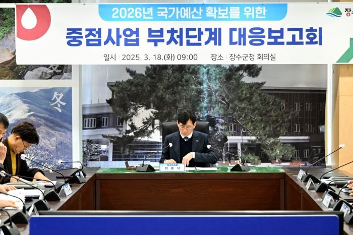 장수군은 18일 군 회의실에서 최훈식 군수 주재로 전 부서장이 참석한 가운데 2026년 국가예산 확보를 위한 전략 마련을 위해 부처단계 대응보고회를 개최했다.이날 보고회에서는 그동안 중앙부처 및 전북자…