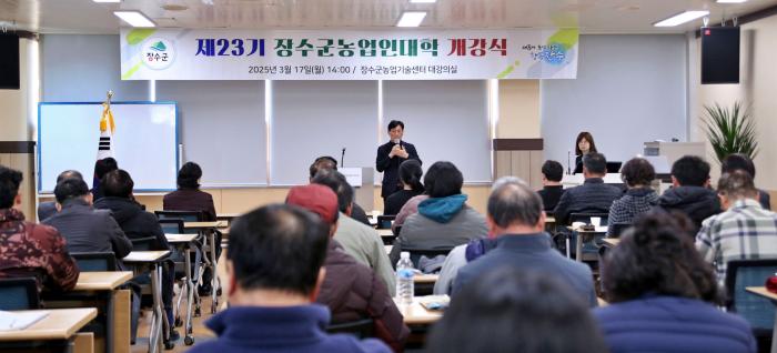 장수군은 지난 17일 농업기술센터 대강의실에서 교육생 100여 명이 참석한 가운데 ‘제23기 농업인대학 개강식’을 성황리에 개최했다고 밝혔다.개강식은 군수 격려사를 시작으로 교육 일정 및 운영방침 안…
