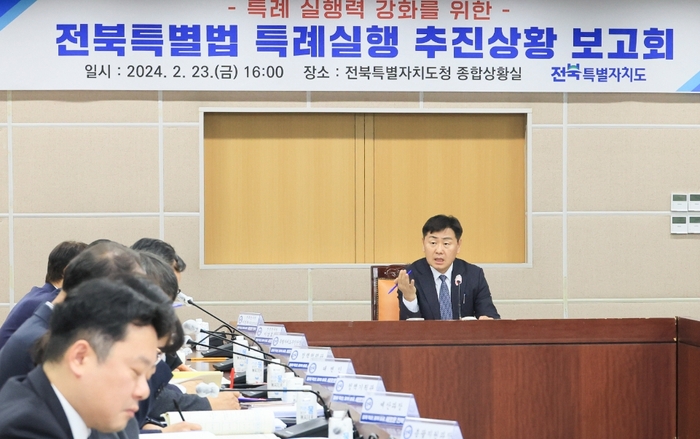 전북자치도가 특별법 시행에 따른 각종 특례 추진에 앞서 제도적 정비를 완료하기 위해 각 특례별로 추진상황을 정기 점검하는 등 행정력을 집중해 나가기로 했다. 전북자치도는 23일 도청 회의실에서 김관영 도지사를 비롯 실․국․원장, 전북연구원 관계자 등이 참석한 가운데 전북특별법 특례실행 진행상황 보고회를 열고 특례별 실행계획을 점검하고 주요 특례에 대한 추진방향 및 계획에 대한 논의를 벌였다. 전북자치도는 이날 보고회를 시작으로 매월 추진상황을 공유하고 토론하는 등 각 특례별 추진상황을 도지사가 직접 점검해 나갈 계획이다. 전북자치도는 그동안 ‘올해 제도 정비 완료, 내년 실행!’을 목표로 권한위임과 권한창설, 사업연계 조문 및 비사업 조문으로 특례를 분류하고 필수 절차를 제도화함으로써 특례 실행을 위한 준비를 벌여왔다. 특히 특례별 준비단을 구성하고 이를 중심으로 자체 방향설정, 기본구상과제, 기본계획수립 용역, 실시계획수립 용역 후 조례와 지침을 마련하는 데 주력하고 있다. 먼저 지구․특구지정 관련 특례인 농생명산업지구, 문화산업 진흥지구, 친환경 산악관광 지구 지정 등 14건은 다른 특례에 우선해 실시할 계획이다. 3년 한시 조항 특례인 출입국관리법, 환경영향평가 특례는 지구, 특구 등 용도 지역이 적용되는 만큼 용도 지정 후 바로 시행될 수 있도록 속도감 있게 4개 용도지역 특례와 한시 조항 실행계획을 동시에 추진할 구상이다. 또한 재정 분석결과 국가예산 반영 대상 특례는 17건 1조9천6백15억으로 분석됐으며 해당 특례는 국가예산 사업화 및 국비 지원이 가능하도록 대응하고 국가예산 대상 사업 지속 확대를 위해 향후 특례 발굴 및 법안개정 시 반영시킬 예정이다. 이와 함께 지난 1월 25일부터 2월 5일까지 10일간 찾아가는 도민보고회 시 각 시․군에서 발전전략으로 제시한 핵심사업은 상반기 시군 자체 용역을 거쳐 하반기에 도 계획 및 용역에 포함하고 공동으로 중앙부처 협의 등을 추진한다는 방침이다. 한편 전북자치도는 그간 특례실행 본격추진을 위해 특례별 자체방향설정과 계획수립을 실시했으며 9개 과제에 대해 기본구상 연구과제 착수한 상태다. 김관영 도지사는 “특별법에 담긴 각종 특례는 우리 전북의 산업을 재편하는 등 새롭게 부흥시킬 수 있는 중요한 요소”라며 “도정을 혁신하고 체질을 바꾸는 방향으로 특례를 추진하고 내년부터는 알찬 성과를 거둘 수 있도록 특례실행 준비에 만전을 기하겠다”고 말했다. /유연순 기자