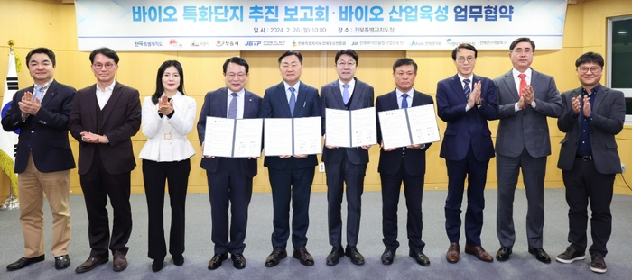 전북자치도는 26일 전북자치도청 중회의실에서 김관영 도지사와 우범기 전주시장, 정헌율 익산시장, 이학수 정읍시장 등이 참석한 가운데 바이오산업 육성을 위한 업무협약을 체결했다고 밝혔다.