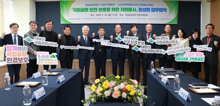국립공원공단 서부지역본부는 18일 서부지역본부에서 전북자치도자원봉사센터, 내장산국립공원사무소, 덕유산국립공원사무소, 변산반도국립공원사무소, 새만금환경생태단지관리단, 정읍시자원봉사센터, 무주군자원봉사센터, 부안군자원봉사센터와 함께 자원봉사 활성화를 위한 다자간 업무협약을 체결했다.