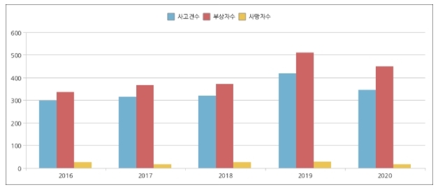 최근 5년간(2016~2020년) 전북 도내 이륜차 교통사고는 연평균 341건 발생했으며, 이로 인해 다수의 사망자와 부상자가 발생했다. 꾸준히 증가하던 사고 건수가 2020년에는 전년 대비 감소하였기 때문에, 올해 역시 이륜차 사고가 전년 대비 증가하지 않도록 각별히 주의할 필요가 있다.
