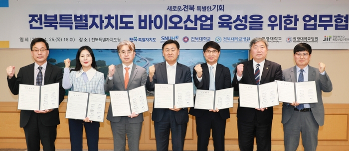 도는 25일 도청 회의실에서 김관영 지사와 분당서울대학교병원 전영태 부원장, 전북대 안국찬 부총장, 원광대 박성태 총장, 원광대병원 서일영 병원장 등이 참석한 가운데 전북 바이오산업 육성을 위한 업무협약을 체결했다.