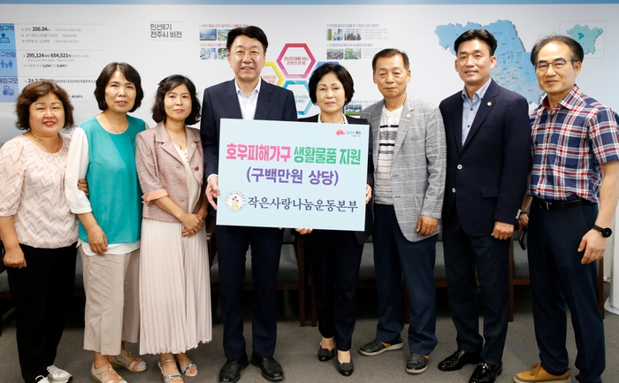 전주시는 각종 봉사활동에 앞장서 온 작은사랑운동본부(이남숙 대표)가 7일 집중호우 피해 가구를 위해 써달라며 900만원 상당의 구호 물품을 기부했다고 밝혔다.