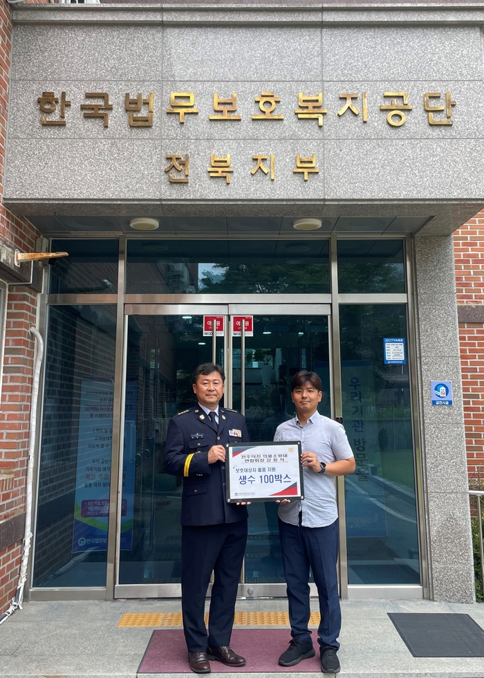 한국법무보호복지공단 전북지부(지부장 황경주)는 2023년 8일 전주덕진의용소방대 강정석 연합회장으로부터 생수 100박스를 전달 받았다고 밝혔다.