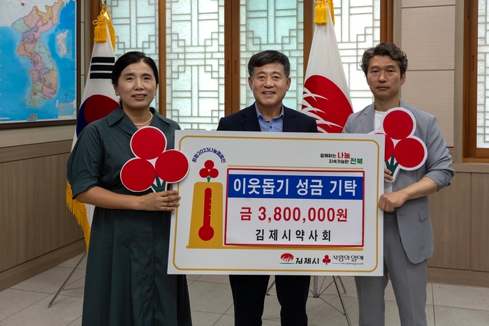 김제시약사회(회장 박환철, 정기만 재정이사)는 18일 김제시를 찾아 노인복지센터 어르신들의 건강 유지를 위한 의약품 구입에 써 달라며 380만 원의 성금을 기탁했다.