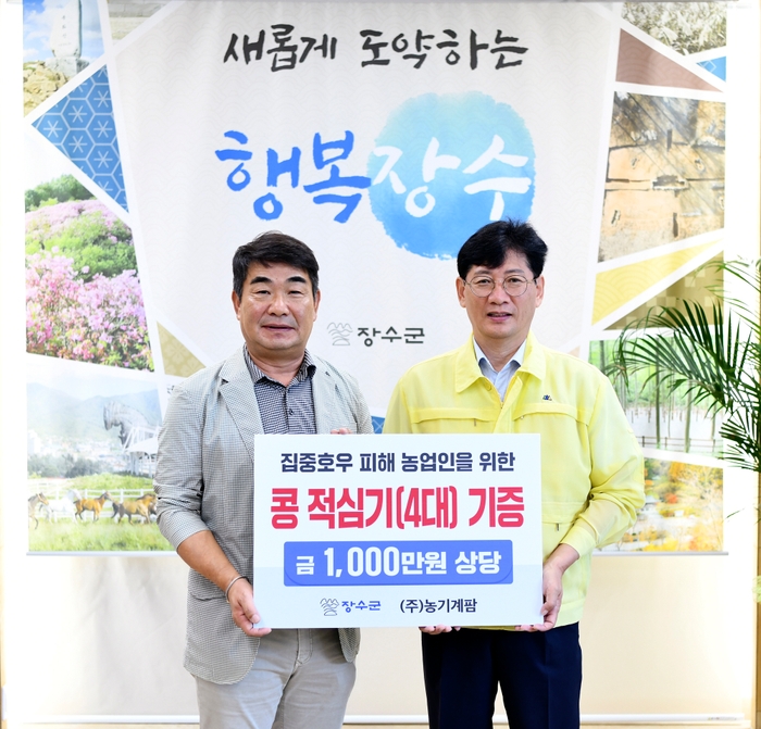 장수군은 23일 농업 및 임업용기계 제조업체인 농기계팜(대표 조경아)으로부터 지속된 호우와 태풍으로 인해 피해를 입은 논콩재배농가들을 위해 써달라며 1000만원 상당의 콩 적심기 4대를 기증받았다고 밝혔다.