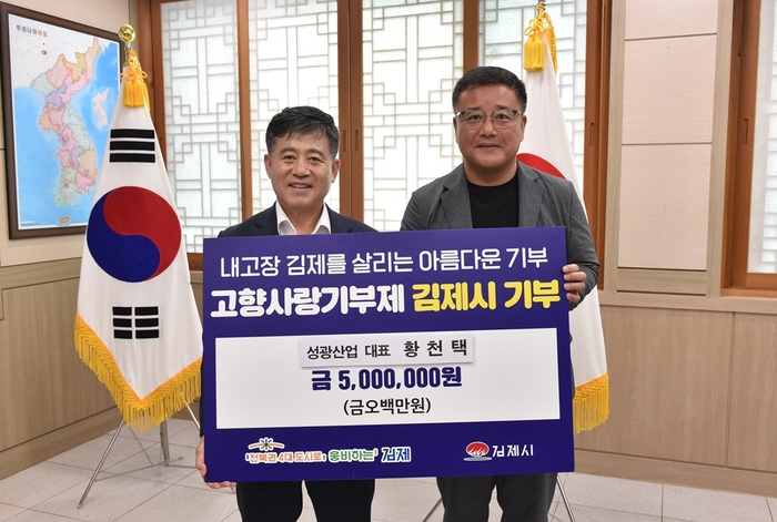 성광산업 황천택 대표는 24일 김제시를 방문하여 고향사랑기부로 최고액인 500만 원을 기탁하였다.