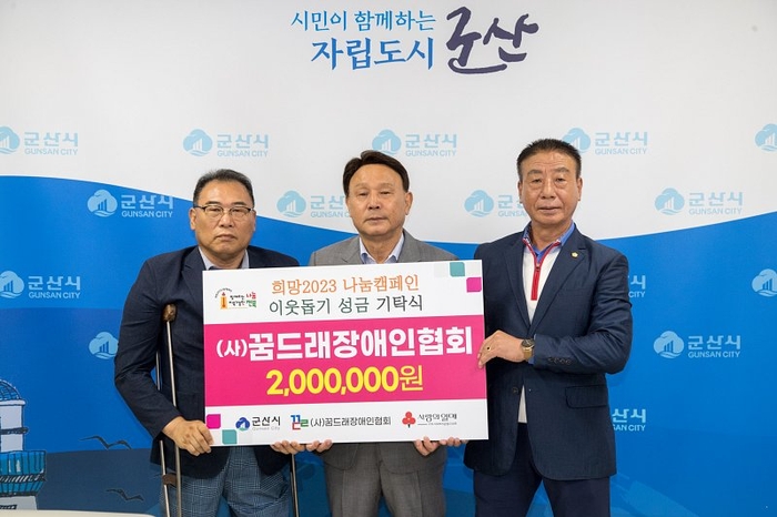 군산시는 28일 (사)꿈드래장애인협회(회장 하태복)가 아동양육시설 일맥원에 아이들을 위해 써달라며 200만원 성금을 기탁했다고 밝혔다.
