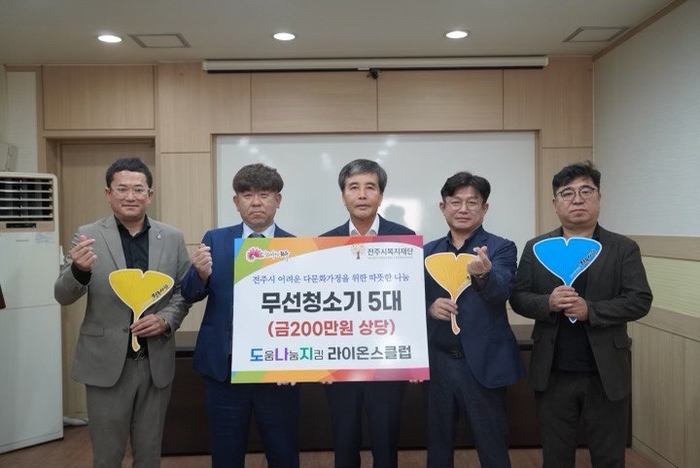 국제라이온스협회 356-C지구 도나지 라이온스클럽(회장 곽정관)은 6일 전주시복지재단 전주사람(이사장 윤방섭)을 찾아 저소득 다문화가정 5쌍을 위한 무선청소기 5대(200만 원 상당)를 기탁했다.