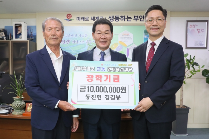 부안군 동진면 제내마을에 거주하는 김길봉씨는 지난 19일 부안군근농인재육성재단을 방문하여 지역 인재육성을 위해 써달라며 장학금 1,000만원을 기탁했다.