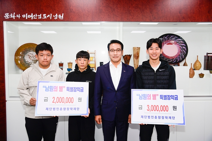 (재)춘향장학재단(이사장 최경식 남원시장)은 지난 10월 20일 근대5종 대회에서 수상한 형태극 선수와 복싱대회에서 수상한 곽효준, 김태완선수에게 “남원의 별” 특별 장학금을 지급했다.