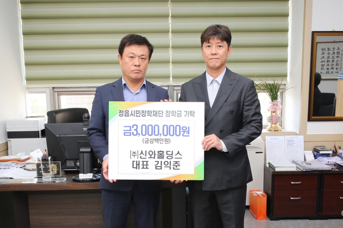 한국공인중개사협회 정읍시지회(지회장 홍성옥)와 ㈜신와홀딩스(대표 김익준)는 20일 정읍시청을 방문해 정읍시민장학재단에 각각 장학금 200만원과 300만원을 기탁했다.