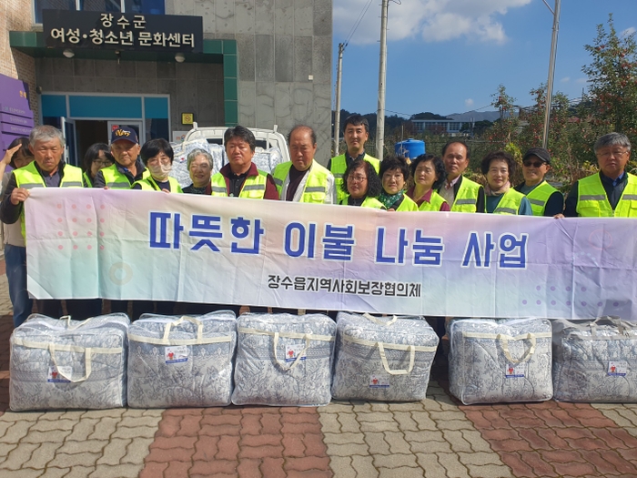 장수군 장수읍지역사회보장협의체(공동위원장 김기완, 김인기)는 23일 동절기를 맞아 지역 내 취약계층 33세대에 따뜻한 겨울나기를 위한 이불을 전달했다.