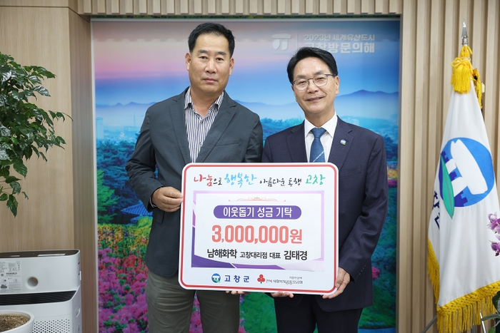 남해화학(주) 고창대리점(대표 김태경)이 지난해에 이어 올해도 고창군 저소득층 및 취약계층을 위해 이웃돕기성금 300만원을 기탁했다.