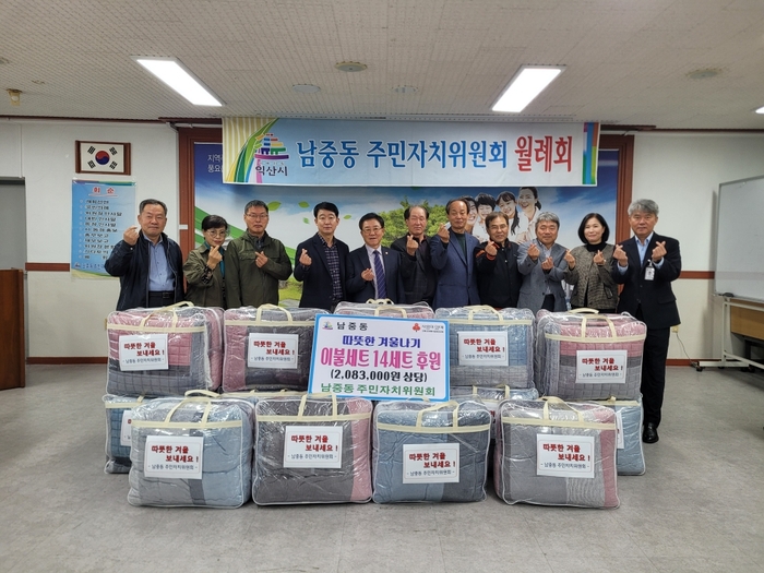남중동 주민자치위원회(위원장 장광숙)는 9일 지역 소외계층이 겨울을 따뜻하게 보낼 수 있도록 이불세트 14세트(208만 원 상당)를 남중동행정복지센터에 기탁했다.