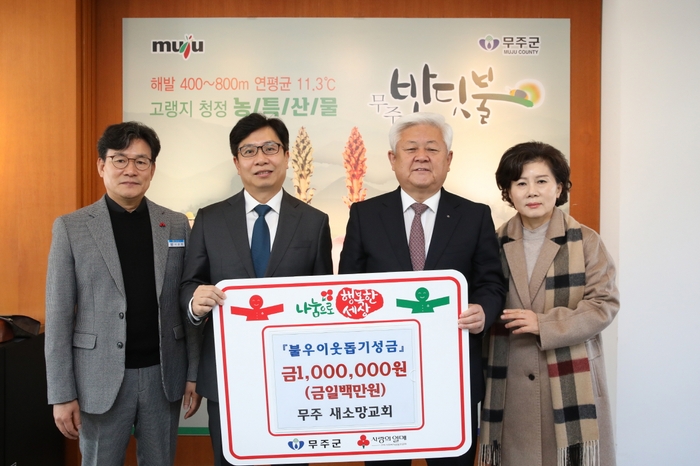 무주군은 지난 13일 무주읍 소재 새소망교회에서 이웃돕기 성금 1백만 원을 기탁해 왔다고 밝혔다. 이날 전달된 성금은 새소망교회 여전도회에서 진행했던 ‘사랑 나눔 행복 바자회’ 수익금 중 일부로 알려져 훈훈함을 더하고 있다.