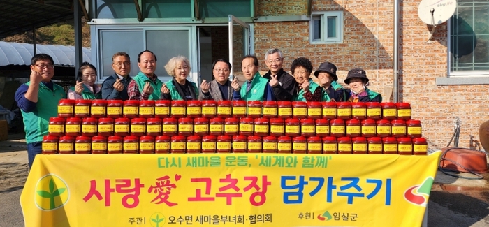 임실군 오수면 새마을부녀회(부녀회장 김옥남)가 지난 15일 독거노인 및 저소득층 지원을 위해 오수면 오산리 새마을부녀회장 댁에서 사랑애(愛) 고추장 담그기 행사를 진행했다.