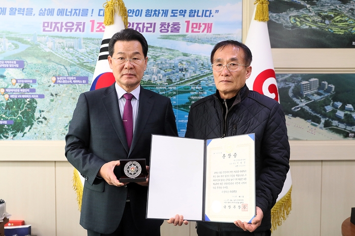권익현 부안군수가 6.25전쟁 유공자인 고(故) 이원진 중사의 자녀 이순열(65)씨에게 화랑 무공훈장을 전수했다. 전수식은 28일 부안군청에서 열렸다.