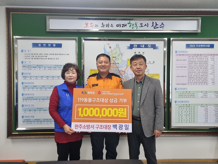 백 구조대장은 지난 11월 국회의사당에서 열린 제2회 119동물구조대상 시상식에서 받은 상금을 4일 봉동읍 행정복지센터를 방문해 시상금 일부를 사랑의 열매 ‘전북사회복지공동모금회’에 기부했다.