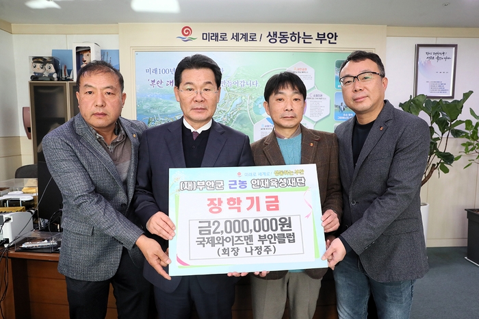 국제와이즈멘 부안클럽(회장 나정주)에서 지난 7일 부안군 근농인재육성재단을 방문하여 장학금 200만원을 지역 인재육성을 위한 장학금으로 기탁했다.