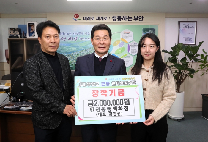 부안군 부안읍 안전용품백화점(대표 김진선)에서 지난 7일 부안군 근농인재육성재단을 방문하여 장학금 200만원을 지역 인재육성을 위한 장학금으로 기탁했다.