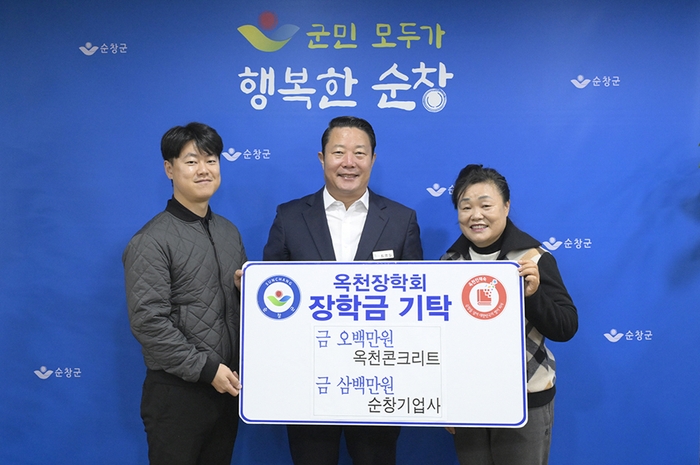 순창군은 11일 순창기업사(대표 봉성배)가 300만원, 옥천콘크리트(대표 서명옥)가 500만원을 순창군 옥천장학회에 기탁했다고 밝혔다.
