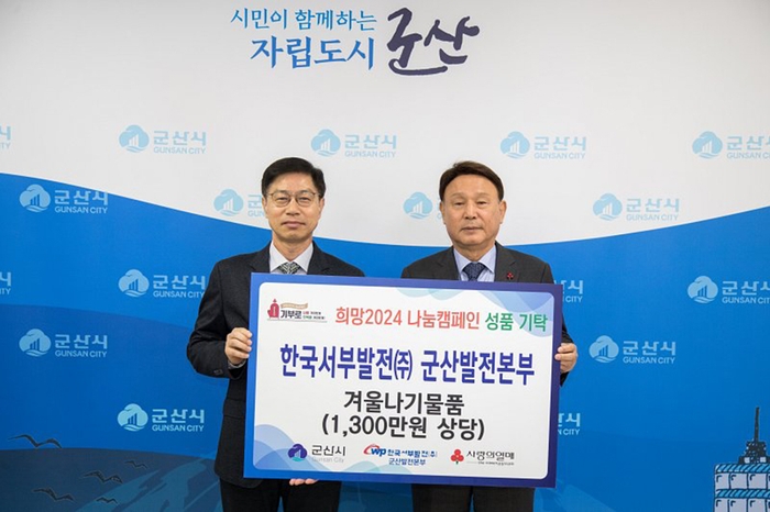 군산시는 한국서부발전㈜ 군산발전본부(본부장 황호연)가 12일 전기매트, 겨울이불 60세트, 건강음료 80상자(1,300만원 상당)를 전달해 연말연시 나눔 온도를 올리는데 동참했다고 밝혔다.