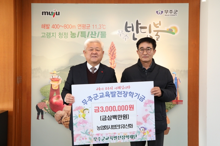 무주군은 26일 농업회사법인 (유)신화가 무주군교육발전장학재단에 장학금 3백만 원을 기탁했다고 밝혔다.