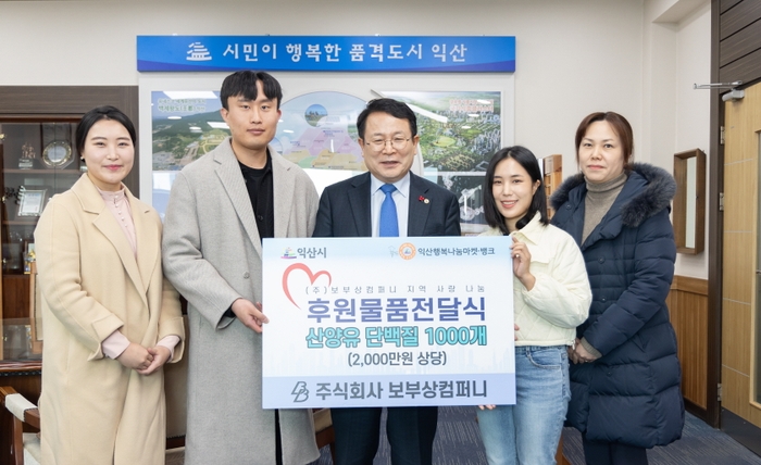 ㈜보부상컴퍼니(대표 백두현)가 12일 익산시청을 방문해 나눔곳간에 산양유 단백질 1,000개를 기탁했다.